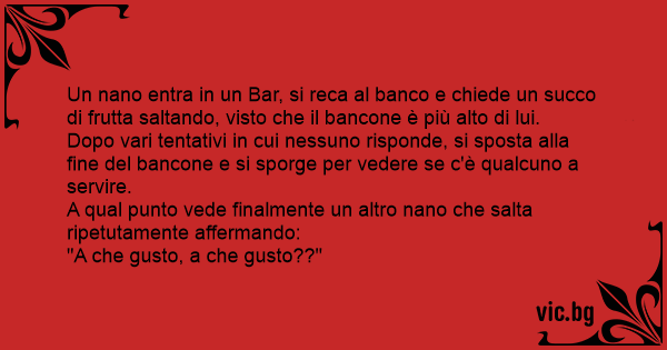 Un nano entra in un Bar, si reca al banco e chiede un succo di frutta saltando, visto che il bancone è più alto di lui.