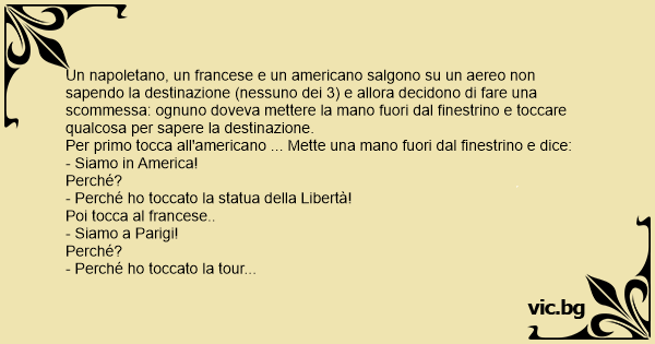 Un napoletano, un francese e un americano salgono su un aereo non sapendo la destinazione (nessuno dei 3) e allora decidono di fare una scommessa: ognuno doveva mettere la mano fuori dal finestrino e toccare qualcosa per sapere la destinazione.