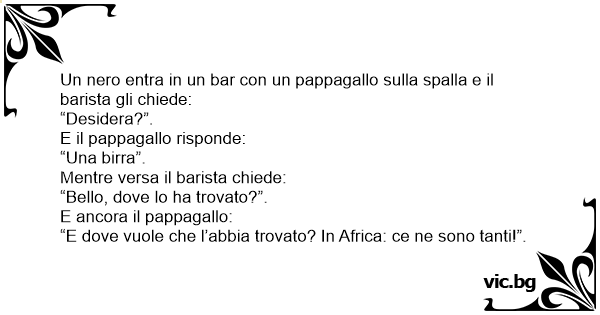 Ulazi u kafanu crnac sa ogromnim papagajem na ramenu. - "Gde si nabavio to čudo?" upita ga konobar. - "U Africi, ima ih na milione", odgovori papagaj.