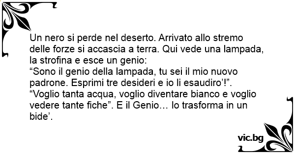 Un nero si perde nel deserto. Arrivato allo stremo delle forze si accascia a terra. Qui vede una lampada, la strofina e esce un genio: