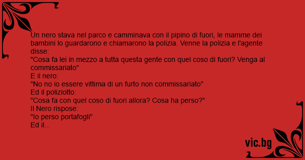 Un nero stava nel parco e camminava соn il pipino di fuori, le mamme dei bambini lo guardarono e chiamarono la polizia. Venne la polizia e l'agente disse: