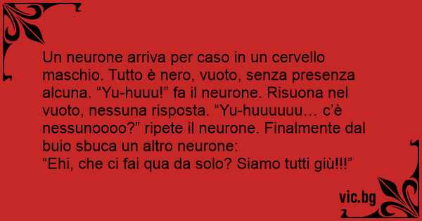 En kvinnlig hjärncell kom fel och kom in i en mans hjärna. Det var alldeles tomt och mörkt där inne. - Hallå? ropade hon men fick inget svar. Hon gick längre in i hjärnan. - Hallå? Hon fick fortfarande inget svar. Då bestämde hon sig för att gå så...