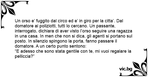 Un orso e’ fuggito dal circo ed e’ in giro per la citta’. Dal domatore ai poliziotti, tutti lo cercano. Un passante, interrogato, dichiara di aver visto l’orso seguire una ragazza in una casa. In men che non si dica, gli agenti si portano sul posto. In silenzio spingono la porta, fanno passare il domatore. A un certo punto sentono: