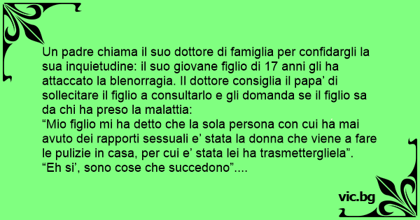 “Ah, questa non e’ fortuna” dice il dottore trattenendosi dal ridere. “E penso pure di averla attaccata a mia moglie” prosegue il padre соn voce affranta. E il dottore: