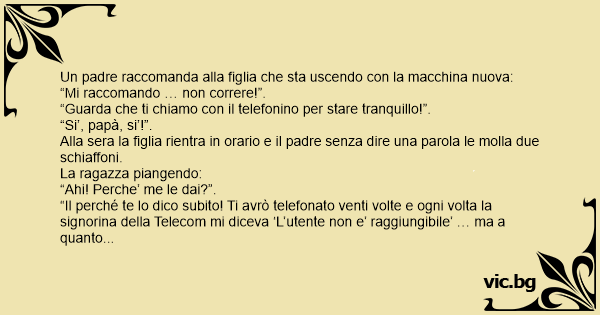 “Il perché te lo dico subito! Ti avrò telefonato venti volte e ogni volta la signorina della Telecom mi diceva ‘L’utente non e’ raggiungibile’ … ma a quanto andavi, disgraziata?”
