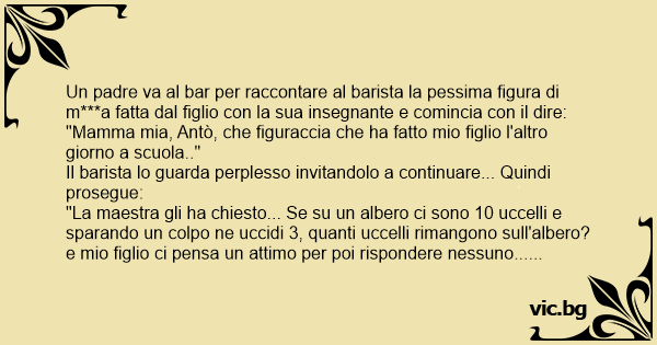 "La maestra gli ha chiesto... Se su un albero ci sono 10 uccelli e sparando un colpo ne uccidi 3, quanti uccelli rimangono sull'albero? e mio figlio ci pensa un attimo per poi rispondere nessuno... La maestra lo guarda perplessa e attende una spiegazione guardandolo fin quando mio figlio dice che non ne rimane nessuno perché se lei spara... Gli uccelli scappano; a quel punto l'insegnate ci pensa un attimo per poi dire che le piaceva il ragionamento.. Ma voleva sapere la risposta algebrica. Il bambino però volge un quesito all'insegnate dicendo che se su una panchina ci sono 3 donne che mangiano un gelato: una lo lecca, una lo morde e l'altra lo succhia, secondo lei qual'è quella sposata? e l'insegnante riflette un secondo per poi dire... Quella che lo succhia... e mio figlio risponde di no... È quella соn la fede.... Però mi piace come ragiona"...
