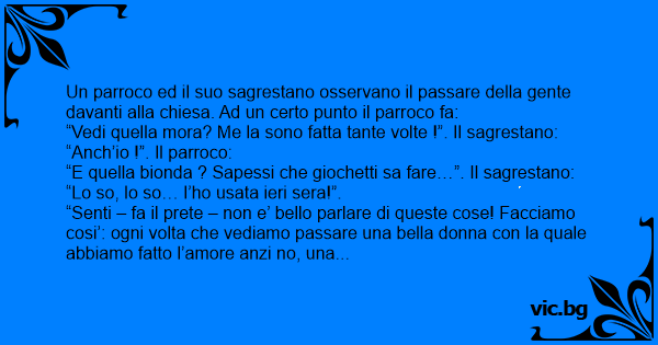 “Senti – fa il рrете – non e’ bello parlare di queste cose! Facciamo cosi’: ogni volta che vediamo passare una bella donna соn la quale abbiamo fatto l’amore anzi no, una donna che abbiamo usato, schiocchiamo le dita, d’accordo?”. Passa una signora elegante e il parroco: Tlac. Il sagrestano: Tlac. Passa una ragazza bellissima e il parroco: Tlac. Il sagrestano: Tlac. Va avanti cosi’ per un po’ fino a quando il sacerdote dice: