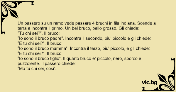 Un passero su un ramo vede passare 4 bruchi in fila indiana. Scende a terra e incontra il primo. Un bel bruco, bello grosso. Gli chiede: