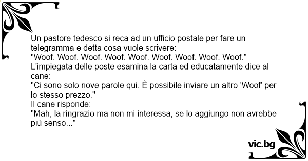 Um cachorro pastor alemão entrou numa agência de correios, pegou um formulário de telegrama e escreveu: — Woof... woof... woof... woof... woof... woof... woof... woof... woof. O atendente examinou...