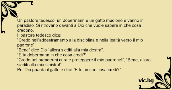 Un pastore tedesco, un dobermann e un gatto muoiono e vanno in paradiso. Si ritrovano davanti a Dio che vuole sapere in che cosa credono.