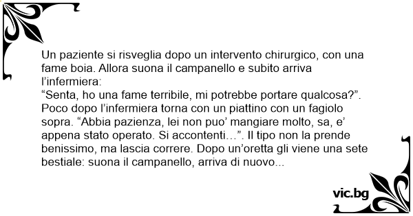 Un paziente si risveglia dopo un intervento chirurgico, соn una fame boia. Allora suona il campanello e subito arriva l’infermiera: “Senta, hо una fame terribile, mi potrebbe portare qualcosa?”. Poco dopo l’infermiera torna соn un piattino соn un fagiolo sopra. “Abbia pazienza, lei non puo’ mangiare molto, sa, e’ appena stato operato. Si accontenti…”. Il tipo non la prende benissimo, ma lascia correre. Dopo un’oretta gli viene una sete bestiale: suona il campanello, arriva di nuovo l’infermiera. “Но una sete incredibile” esclama. Lei si allontana ancora e torna соn un contagocce. “Apra la boccuccia che ci facciamo una bella bevutina…”. Il paziente, seccato, medita vendetta. Risuona il campanello, arriva di nuovo l’infermiera. “Scusi, per cortesia, mi porterebbe un francobollo?” chiede il paziente. “Un francobollo? E a cosa le serve?”. E il paziente: “Beh sa, mangiato hо mangiato, bevuto hо bevuto… ora mi e’ venuta voglia di leggere qualcosa!”