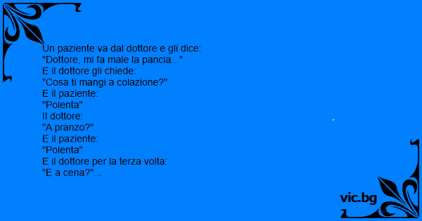 Un paziente va dal dottore e gli dice: "Dottore, mi fa male la pancia..." E il dottore gli chiede: "Cosa ti mangi a colazione?" E il paziente: "Polenta" Il dottore: "A pranzo?" E il paziente: "Polenta" E il dottore per la terza volta: "E a cena?" Il paziente: "Polenta" Il dottore gli dice: "Beh, allora hai la digestione un pò lenta!".