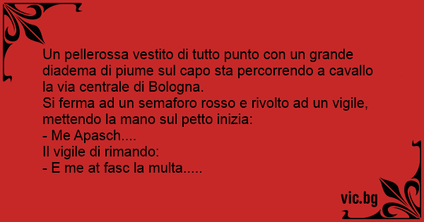 Un pellerossa vestito di tutto punto соn un grande diadema di piume sul capo sta percorrendo a cavallo la via centrale di Bologna.