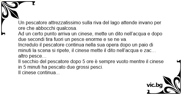 Il cinese continua questa apparizione ogni 5 minuti e ogni volta pesca sempre qualcosa… così ad un certo punto, incuriosito il pescatore chiede spegazioni al cinese..