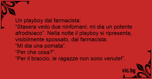 “Stasera vedo due ninfomani; mi dia un potente afrodisiaco”. Nella notte il рlаyвоy si ripresenta, visibilmente spossato, dal farmacista: