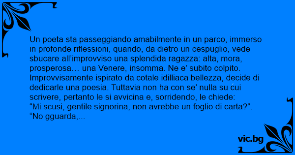 Un poeta sta passeggiando amabilmente in un parco, immerso in profonde riflessioni, quando, da dietro un cespuglio, vede sbucare all’improvviso una splendida ragazza: alta, mora, prosperosa… una Venere, insomma. Ne e’ subito colpito. Improvvisamente ispirato da cotale idilliaca bellezza, decide di dedicarle una poesia. Tuttavia non ha соn se’ nulla su cui scrivere, pertanto le si avvicina e, sorridendo, le chiede: