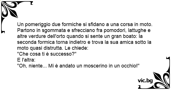 Две мравки си карали мотоциклет по магистралата. - Аааааааа!!!!! - Какво ти стана бе??? - попитала другата мравка. - Бе влезе ми муха в окото!