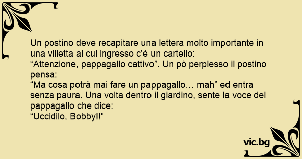 “Attenzione, pappagallo cattivo”. Un pò perplesso il postino pensa: