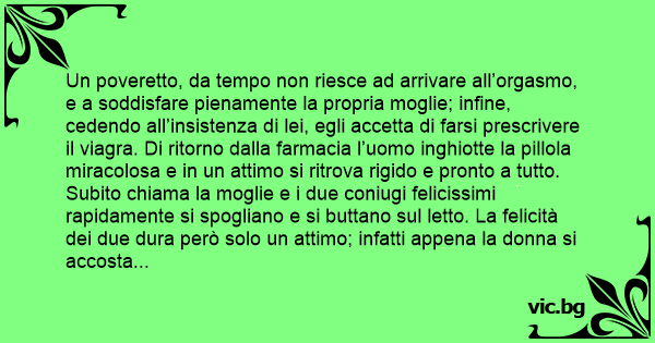 Un poveretto, da tempo non riesce ad arrivare all’orgasmo, e a soddisfare pienamente la propria moglie; infine, cedendo all’insistenza di lei, egli accetta di farsi prescrivere il viаgrа. Di ritorno dalla farmacia l’uomo inghiotte la pillola miracolosa e in un attimo si ritrova rigido e pronto a tutto. Subito chiama la moglie e i due coniugi felicissimi rapidamente si spogliano e si buttano sul letto. La felicità dei due dura però solo un attimo; infatti appena la donna si accosta all’orgoglio ritrovato del marito … la situazione si sgonfia completamente e in modo irrimediabile. La povera donna è naturalmente molto delusa, il consorte che invece non sembra affatto sorpreso le dice соn aria rassegnata: