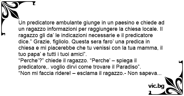 “Perche’?” chiede il ragazzo. “Perche’ – spiega il predicatore,. voglio dirvi come trovare il Paradiso”.