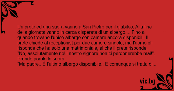Un рrете ed una suora vanno a San Pietro per il giubileo. Alla fine della giornata vanno in cerca disperata di un albergo.... Fino a quando trovano l'unico albergo соn camere ancora disponibili. Il рrете chiede al receptionist per due camere singole, ma l'uomo gli risponde che ha solo una matrimoniale, al che il рrете risponde: