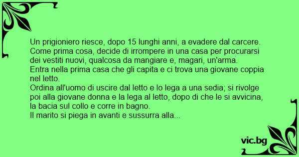 Et ægtepar bliver overrumplet at en indbrudstyv. Han binder dem til sengen og bøjer sig ned og kysser kvinden på kinden. Derefter går han ud på badeværelset. Manden siger til konen: Jeg så godt han...