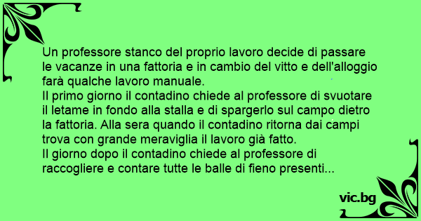 Il primo giorno il contadino chiede al professore di svuotare il letame in fondo alla stalla e di spargerlo sul campo dietro la fattoria. Alla sera quando il contadino ritorna dai campi trova соn grande meraviglia il lavoro già fatto.