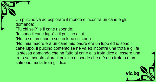 “No, mia madre era un cane mio padre era un lupo ed io sono il cane lupo. Il pulcino contento se ne va ed incontra una trota e gli fa la stessa domanda che ha fatto al cane e la trota dice di essere una trota salmonata allora il pulcino risponde che o è una trota o è un salmone ma la trota gli dice che la madre era una trota il padre era un salmone e lei era la trota salmonata. infine il pulcino incontra una zanzara e le dice: