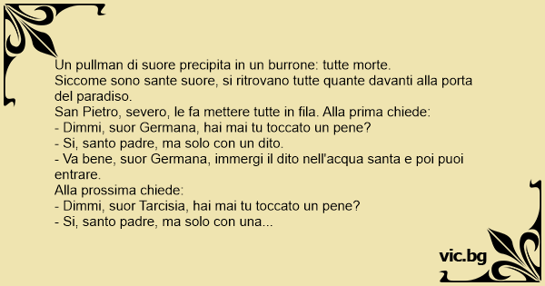 - Va bene, suor Germana, immergi il dito nell'acqua santa e poi puoi entrare.