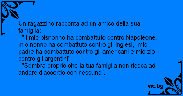 - "Il mio bisnonno ha combattuto contro Napoleone, mio nonno ha combattuto contro gli inglesi, mio padre ha combattuto contro gli americani e mio zio contro gli argentini"