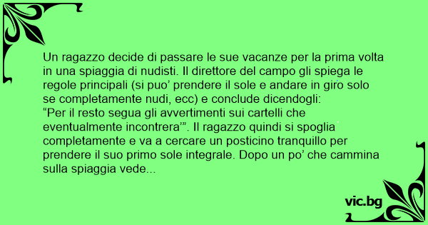 “Per il resto segua gli avvertimenti sui cartelli che eventualmente incontrera’”. Il ragazzo quindi si spoglia completamente e va a cercare un posticino tranquillo per prendere il suo primo sole integrale. Dopo un po’ che cammina sulla spiaggia vede un cartello su cui e’ scritto: