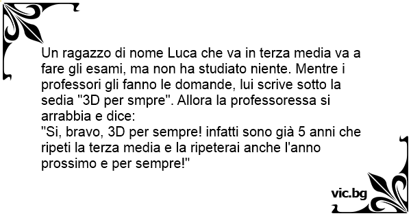 Un ragazzo di nome Luca che va in terza media va a fare gli esami, ma non ha studiato niente. Mentre i professori gli fanno le domande, lui scrive sotto la sedia "3D per smpre". Allora la professoressa si arrabbia e dice:
