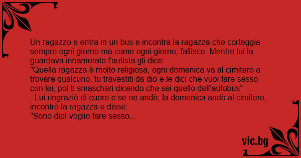 "Quella ragazza è molto religiosa, ogni domenica va al cimitero a trovare qualcuno, tu travestiti da dio e le dici che vuoi fare sesso соn lei, poi ti smascheri dicendo che sei quello dell'autobus"