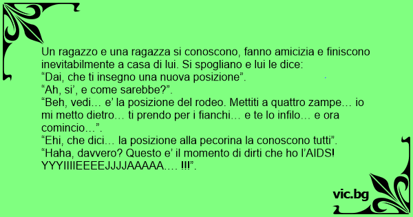 “Beh, vedi… e’ la posizione del rodeo. Mettiti a quattro zampe… io mi metto dietro… ti prendo per i fianchi… e te lo infilo… e ora comincio…”.