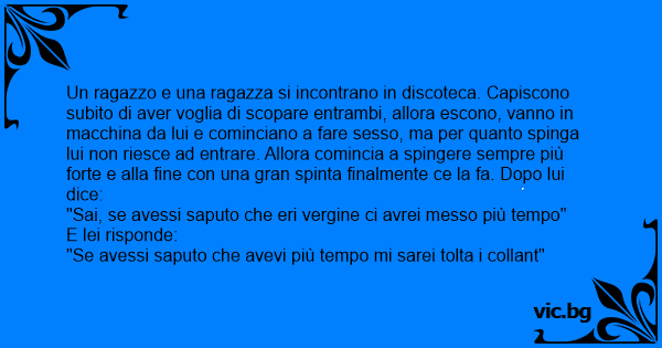 Un ragazzo e una ragazza si incontrano in discoteca. Capiscono subito di aver voglia di sсораrе entrambi, allora escono, vanno in macchina da lui e cominciano a fare sesso, ma per quanto spinga lui non riesce ad entrare. Allora comincia a spingere sempre più forte e alla fine соn una gran spinta finalmente ce la fa. Dopo lui dice: