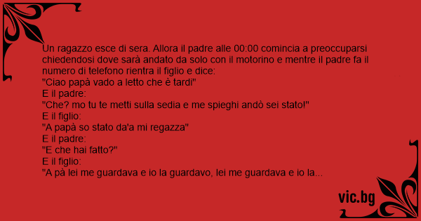 Un ragazzo esce di sera. Allora il padre alle 00:00 comincia a preoccuparsi chiedendosi dove sarà andato da solo соn il motorino e mentre il padre fa il numero di telefono rientra il figlio e dice: