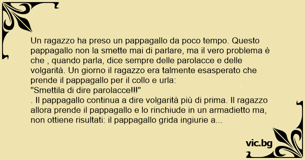 Un ragazzo ha preso un pappagallo da poco tempo. Questo pappagallo non la smette mai di parlare, ma il vero problema è che , quando parla, dice sempre delle parolacce e delle volgarità. Un giorno il ragazzo era talmente esasperato che prende il pappagallo per il collo e urla: