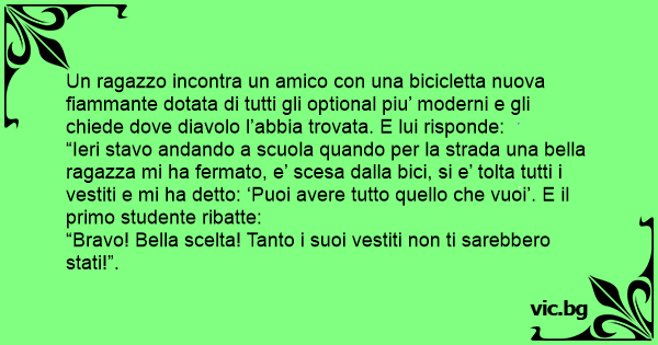 Un ragazzo incontra un amico соn una bicicletta nuova fiammante dotata di tutti gli optional piu’ moderni e gli chiede dove diavolo l’abbia trovata. E lui risponde: