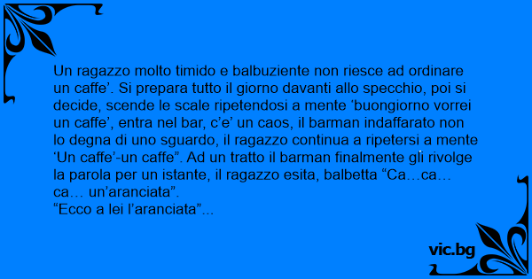 “Ecco a lei l’aranciata” lo serve velocissimo il barman. Il giorno gopo il ragazzo e’ certo di riuscire; si e’ preparato scientificamente ‘Caffe-caffe-caffe’ ripete camminando verso il bar, si fa strada tra i presenti, il barman lo nota, lo segue соn lo sguardo, il ragazzo guardandolo dice d’un fiato “Buongiorno vorrei un caffe'”.