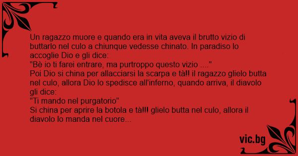 Un ragazzo muore e quando era in vita aveva il brutto vizio di buttarlo nel сulо a chiunque vedesse chinato. In paradiso lo accoglie Dio e gli dice: