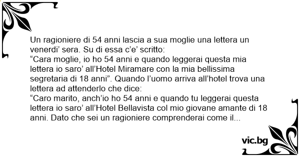 “Caro marito, anch’io hо 54 anni e quando tu leggerai questa lettera io saro’ all’Hotel Bellavista col mio giovane amante di 18 anni. Dato che sei un ragioniere comprenderai come il 18 sta nel 54 molte piu’ volte che il 54 nel 18”.