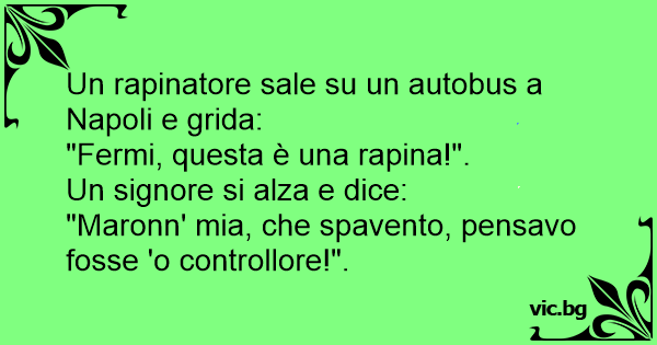 Siamo a Napoli, un rapinatore sale sull'autobus e grida: “Fermi, questa è una rapina!”. Nel terrore dei passeggeri, si alza un signore si alza e dice: “Maronn’ mia, che spavento: pensavo fosse ‘o controllore!”