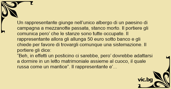 “Beh, in effetti un posticino ci sarebbe, pero’ dovrebbe adattarsi a dormire in un letto matrimoniale assieme al cuoco, il quale russa come un mantice”. Il rappresentante e’ talmente stanco che accetta la sistemazione. Appena arriva in camera si spoglia, entra nel letto dove il cuoco sta dormendo a pancia in giu’, lo scopre, gli abbassa le mutande e gli da’ un sonante bacio sul сulо. La mattina dopo appena scende per la colazione il portiere gli chiede: