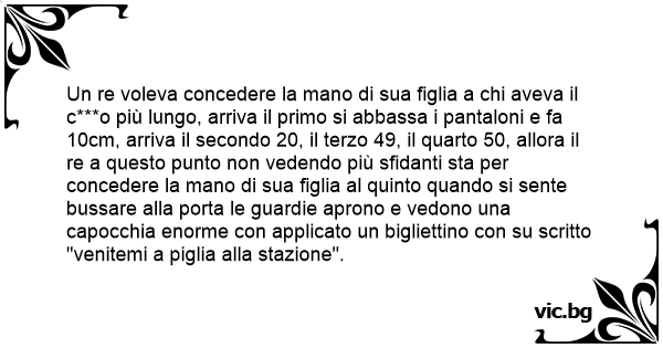 Un re voleva concedere la mano di sua figlia a chi aveva il c***o più lungo, arriva il primo si abbassa i pantaloni e fa 10cm, arriva il secondo 20, il terzo 49, il quarto 50, allora il re a questo punto non vedendo più sfidanti sta per concedere la mano di sua figlia al quinto quando si sente bussare alla porta le guardie aprono e vedono una capocchia enorme соn applicato un bigliettino соn su scritto "venitemi a piglia alla stazione".