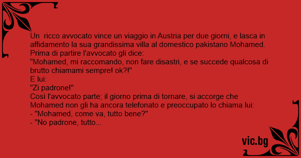 Un ricco avvocato vince un viaggio in Austria per due giorni, e lasca in affidamento la sua grandissima villa al domestico pakistano Mohamed.