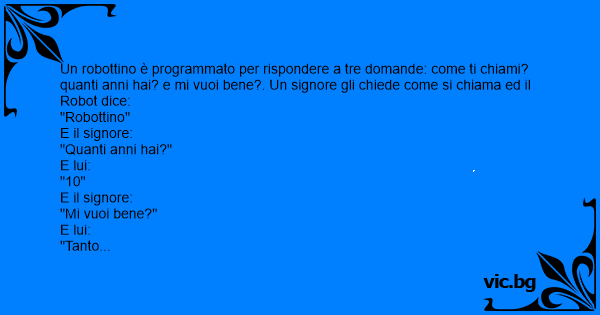 Un robottino è programmato per rispondere a tre domande: come ti chiami? quanti anni hai? e mi vuoi bene?. Un signore gli chiede come si chiama ed il Robot dice: