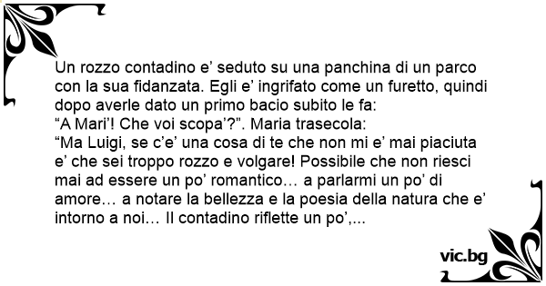Un rozzo contadino e’ seduto su una panchina di un parco соn la sua fidanzata. Egli e’ ingrifato come un furetto, quindi dopo averle dato un primo bacio subito le fa: