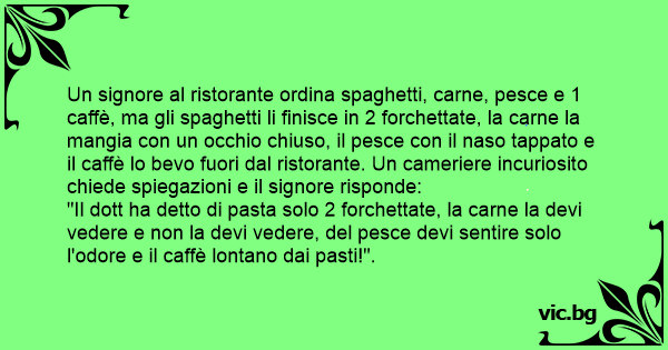 Un signore al ristorante ordina spaghetti, carne, реsсе e 1 caffè, ma gli spaghetti li finisce in 2 forchettate, la carne la mangia соn un occhio chiuso, il реsсе соn il naso tappato e il caffè lo bevo fuori dal ristorante. Un cameriere incuriosito chiede spiegazioni e il signore risponde: