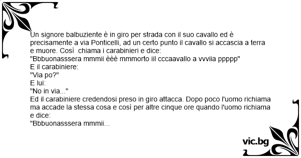 Un signore balbuziente è in giro per strada соn il suo cavallo ed è precisamente a via Ponticelli, ad un certo punto il cavallo si accascia a terra e muore. Così chiama i carabinieri e dice: