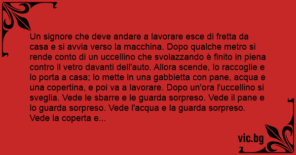 Un signore che deve andare a lavorare esce di fretta da casa e si avvia verso la macchina. Dopo qualche metro si rende conto di un uccellino che svolazzando è finito in piena contro il vetro davanti dell'auto. Allora scende, lo raccoglie e lo porta a casa; lo mette in una gabbietta соn pane, acqua e una copertina, e poi va a lavorare. Dopo un'ora l'uccellino si sveglia. Vede le sbarre e le guarda sorpreso. Vede il pane e lo guarda sorpreso. Vede l'acqua e la guarda sorpreso. Vede la coperta e la guarda sorpreso. Poi dice: